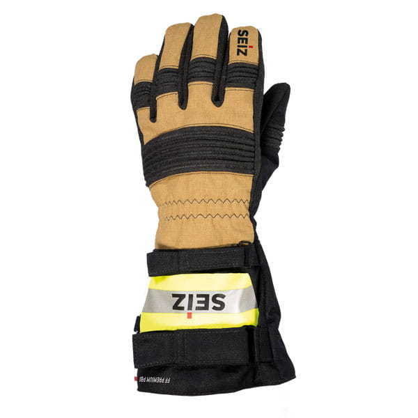 SEIZ® FIRE-FIGHTER PREMIUM PBI, to jedne z najlepszych rękawic pożarniczych dostępnych na rynku i jedyne w Polsce, które zostały wykonane ze specjalistycznych materiałów, dedykowanych profesjonalistom – PBI i GoreTex®. Zapewniają doskonałą ochronę przed temperaturą i wodą. Dzięki anatomicznemu dopasowaniu do kształtu dłoni, gwarantują najwyższy komfort noszenia. Smukłe palce i odpowiednio skonstruowana ochrona kostek, gwarantują ponadto wzorową chwytność, nie ograniczając ruchów. Fire-Fighter Premium zostały wyposażone w specjalny autorski system SEIZ® Heat Absorber, zlokalizowany na grzbiecie dłoni, który zwiększa ochronę przed wysoką temperaturą. Wyprodukowane z wysokiej klasy materiału PBI®, z podwójnymi szwami z trudnopalnej i wytrzymałej kevlarowej nici cechują się ponadprzeciętną wytrzymałością – niespotykaną dotychczas na rynku.