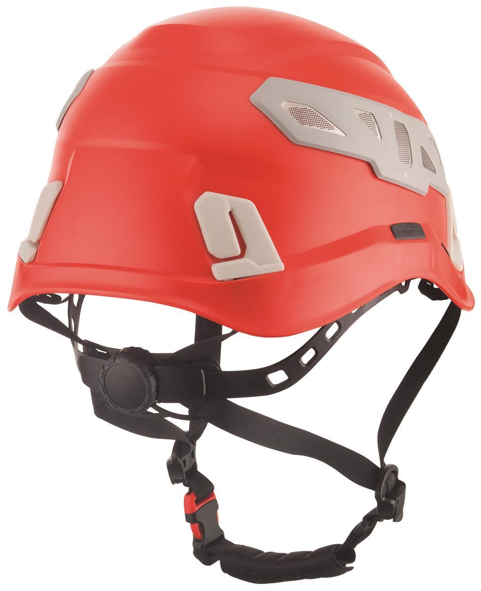 System zawieszania taśmy dostosowuje się do kształtu głowy, zapewniając równomierne i wygodne dopasowanie. Pionowe położenie pałąka z poliamidu można regulować zarówno z przodu, jak i z tyłu. Regulacja pokrętłem jest łatwa w obsłudze jedną ręką oraz zapewnia bezpieczne i precyzyjne dopasowanie. W zestawie znajduje się adapter pozwalający zmniejszyć rozmiar oraz amortyzująca wyściółka w systemie zawieszenia. Opakowanie zawiera również wodoodporne piankowe wypełnienie zastępcze.Pasek pod brodą można łatwo zdjąć podczas używania kasku do prac naziemnych, a klamra jest wyposażona w zabezpieczenie umożliwiające oderwanie od 15 do 25 kg. Kask posiada punkty mocowania do ochrony uszu, wizjera oraz latarki.