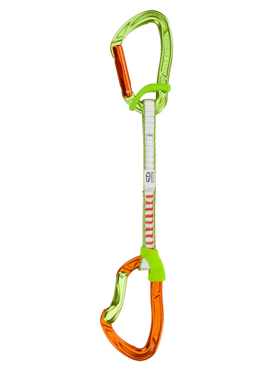 Zastosowane karabinki to najnowsza wersja modelu Nimble Evo. Górny karabinek wyposażono w prosty zamek, natomiast dolny posiada gięty zamek, który znacznie ułatwi wpinanie weń liny. Karabinki wykonano ze stopów lekkich, co pozwala zachować niską wagę. Opanowanie przez firmę Climbing Technology technologii kucia na gorąco, pozwala uzyskiwać wymyślne kształty karabinków, co przekłada się bezpośrednio na ich fantastyczną poręczność i wysoką wytrzymałość. Dodatkowo korpus poddano anodyzacji, która gwarantuje świetny wygląd i optymalne właściwości użytkowe.